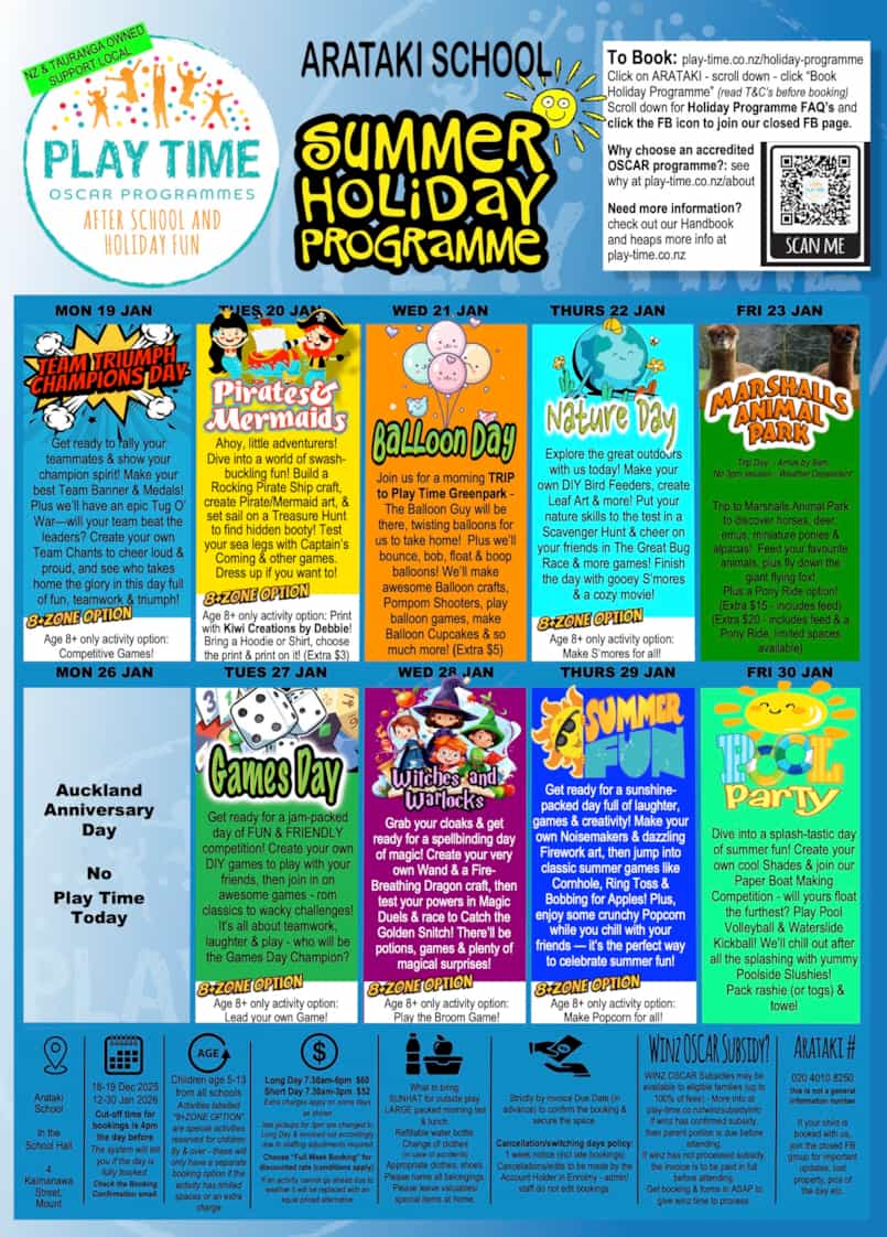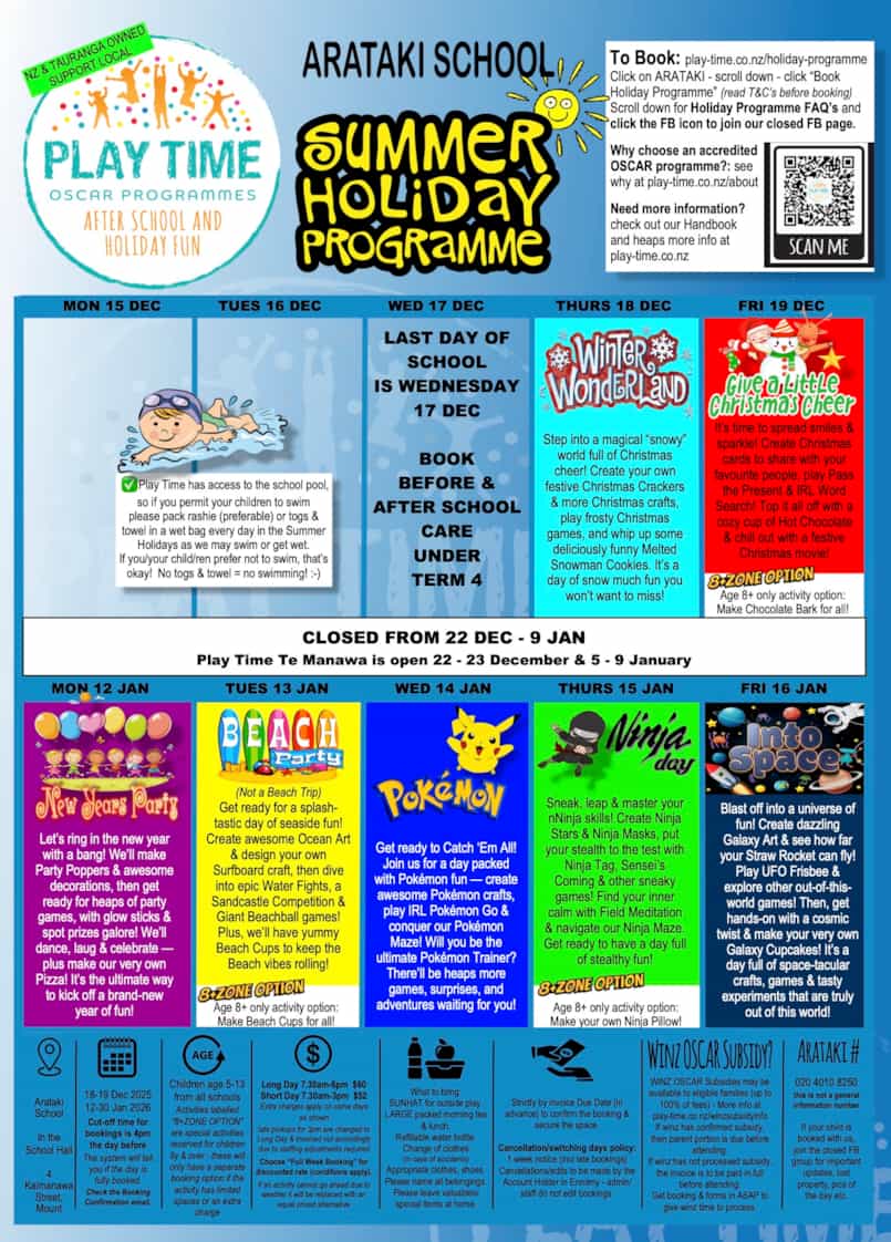 Friends of the School Arataki Christmas on the Field: A Night of Fun and Generosity! Last night's Christmas on the Field was a huge success, thanks to the fantastic weather and incredible community spirit! Fun was had by all, with the bouncy castle slides buzzing all evening and great competitive spirit at the games like Ring Toss and Three in a Row. The evening was made possible by the generosity of our sponsors: a massive shout-out to Verge for providing the stage, Baker's Delight for the delicious bread, and Fresh Choice Papamoa for the kai donation. A special thank you to Santa for taking the time to visit and collect all the heartfelt letters written by our students - we hope you get everything you asked for! Finally, our deepest gratitude goes to every single person who donated a hamper item, contributed yummy treats to the bake sale, and to everyone who came to buy last night. especially to our amazing volunteers and kaiako who organized craft stalls, manned the events, ran the BBQ, and managed the set up and pack down. Your time and effort ensure these events are successful every year!  |