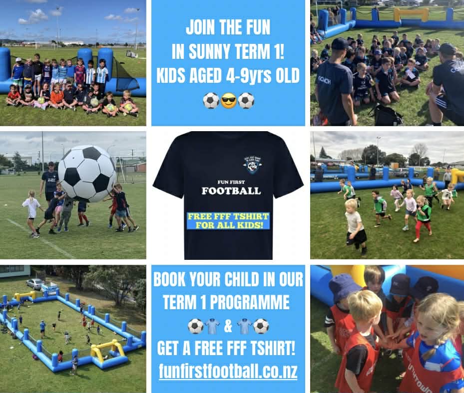 | Our Friends at Fun First Football are filling fast for their most popular sunny Term 1 Programme! Simply go to https://funfirstfootball.co.nz/ to Book your Spot and to receive your kids Free FFF Tshirt! :)  |