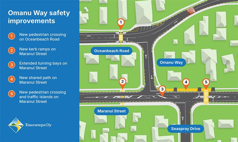 Maranui Street/Omanu Way Safety Improvements We have started works to construct two new pedestrian crossings near Omanu Way, one on Oceanbeach Road and one on Maranui Street. Working hours are generally between 7am and 5pm. However, we will need to undertake some night works prior to 10pm to minimise traffic impact. Please follow the temporary 30km/h speed restrictions at the work sites and at times there will be pedestrian diversions around works on Maranui Street, Seaspray Drive, Oceanbeach Road and OmanuWay. These works are expected to take up to four weeks, weather permitting and if not completed by the Christmas shut down, minor works will be completed in January with minimum disruption.  |