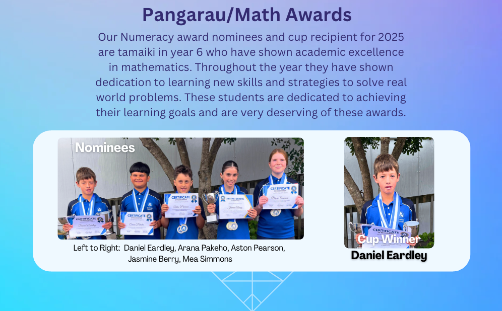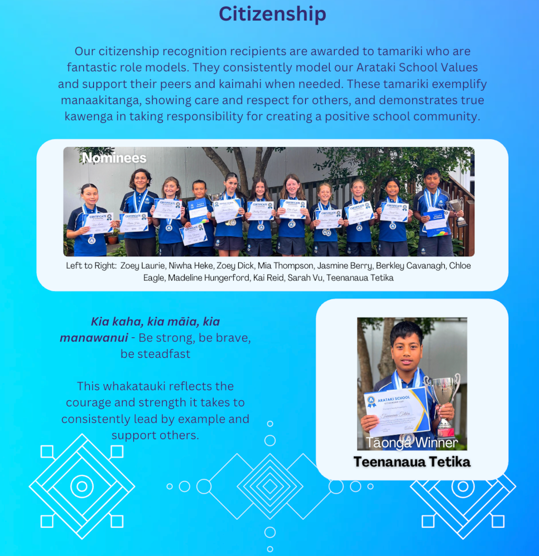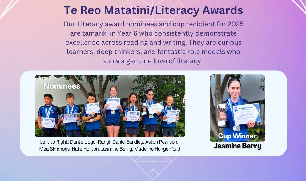 Wow, what an amazing year this year has been. Over the past week, we have been celebrating the achievements of our students here at Arataki School. During this time, it highlighted for me how many opportunities our students have been given, and the successes that students have experienced. Congratulations to all of our trophy and value award recipients.