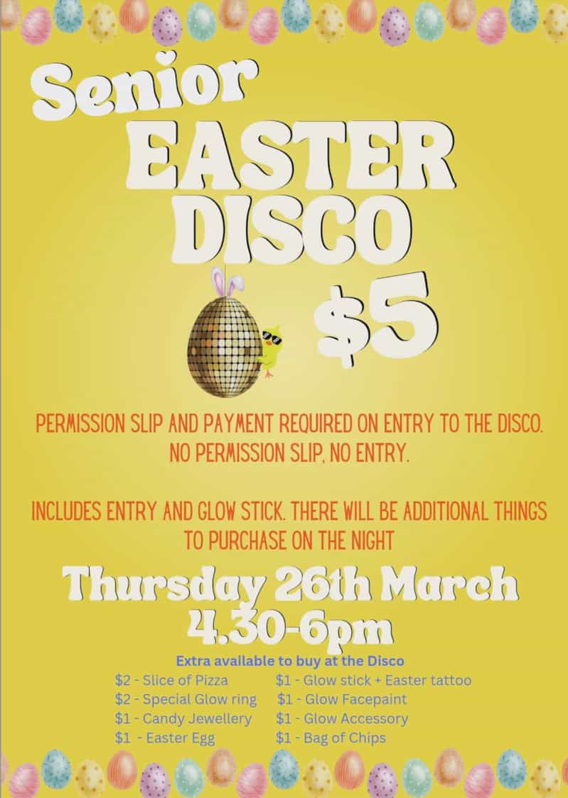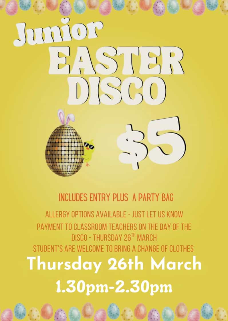 Disco Times: - Juniors (Years 0–3): 1.30pm – 2.30pm