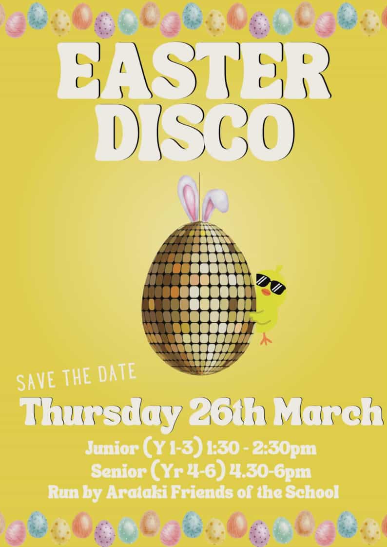 Tickets: Just $5 each Every dollar raised goes towards upgrading our school playground – how awesome is that! Please note, Seniors will pay and give permission slips on entry at the door. Permission slips will be going home next week. Let’s get behind this, bring the energy, and make it a disco to remember Check out the posters for more info! Ngā mihi, The Arataki Friends of School Team  |