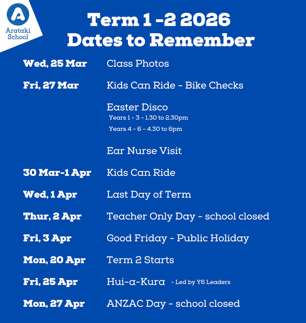 Term 2 Winter Sports: Register Now Registrations are still open for our Winter Sports season! If your child is keen to get active and represent Arataki School on the field or court, please ensure you sign them up before the deadline. Sports Available: How to Register: We are using the Kindo app for all registrations this year. It’s the quickest and easiest way to ensure your child is on the team list. Registration Deadline: All sign-ups must be completed by March 31, 2026. Late entries may not be able to be placed in a team, so don't miss out! School Uniform Reminder As we head toward the cooler months, just a friendly reminder regarding our school uniform expectations. We take great pride in our school identity, and seeing everyone in the correct gear helps foster that sense of belonging. We are noticing some children wearing incorrect school shorts. Please ensure your child is wearing their Arataki School uniform shorts to school. Reminder, we do sell second hand uniform from the school office for $5.00 per item.  |